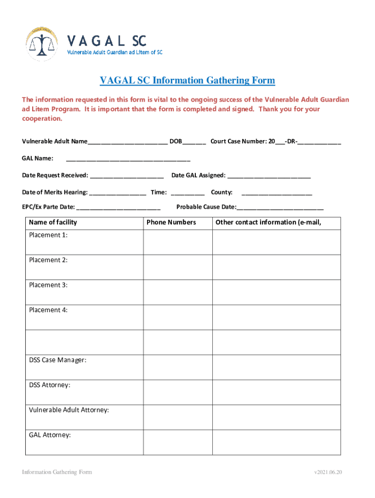 VA GAL SC Information Gathering Form The information requested in this form is vital to the ongoing success of the Vulnerable Adult Guardian ad Item Program. It is important that the form is completed