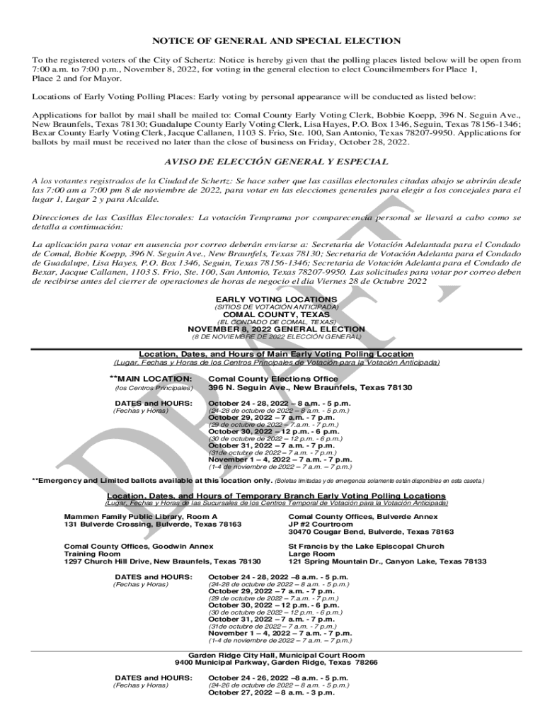 Get the free NOTICE OF GENERAL AND SPECIAL ELECTION - Schertz, TX