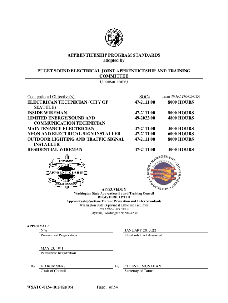 APPRENTICESHIP PROGRAM STANDARDS adopted by PUGET SOUND ELECTRICAL JOINT APPRENTICESHIP AND TRAINING COMMITTEE (sponsor name) Occupational Objective(s): ELECTRICAL TECHNICIAN (CITY OF SEATTLE) INSIDE