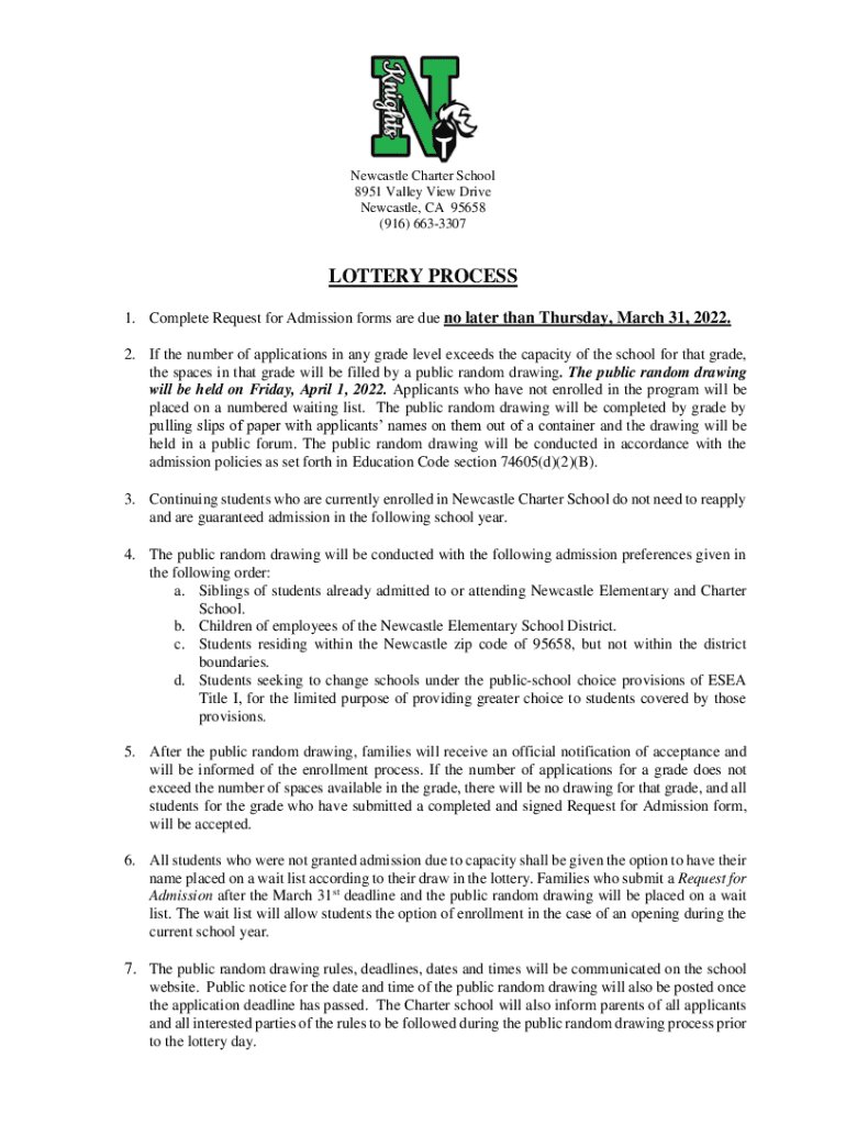 Newcastle Charter School 8951 Valley View Drive Newcastle, CA 95658 (916) 6633307LOTTERY PROCESS 1. Complete Request for Admission forms are due no later than Thursday, March 31, 2022. 2. If the number