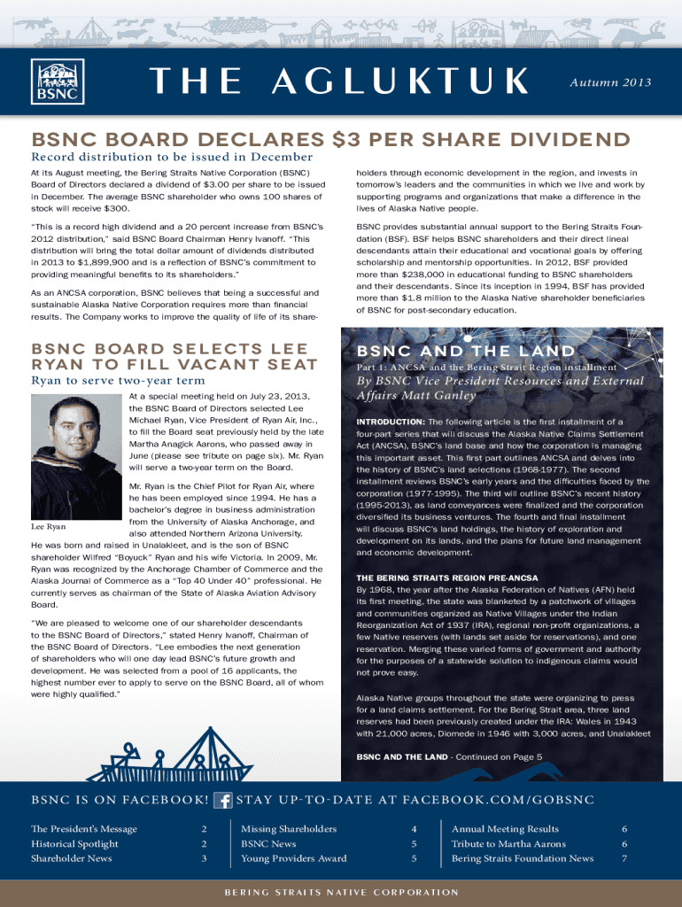 THE AGLUKTUKAutumn 2013BSNC BOARD DECLARES $3 PER SHARE DIVIDEND Record distribution to be issued in December At its August meeting, the Bering Straits Native Corporation (SNC) Board of Directors