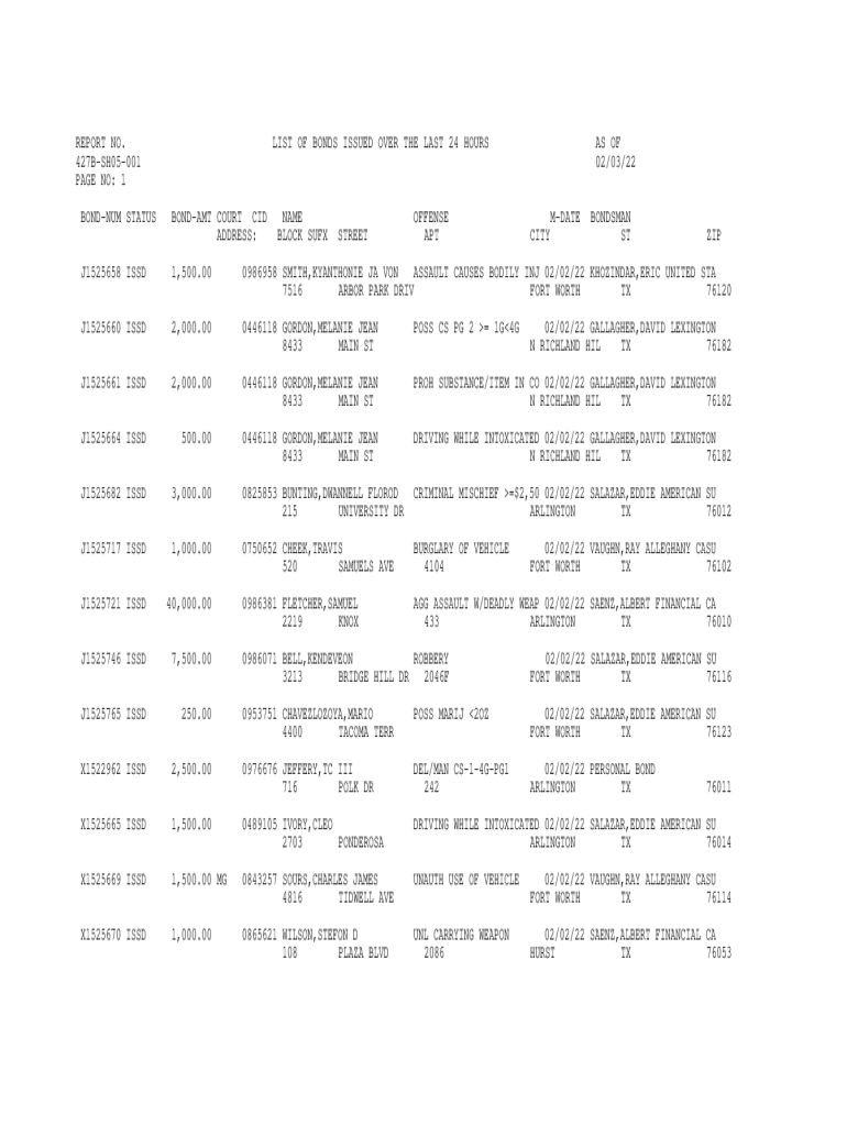 BOND STATUSES OF BONDS ISSUED OVER THE LAST 24 HOURSBONDAMT COURT CID