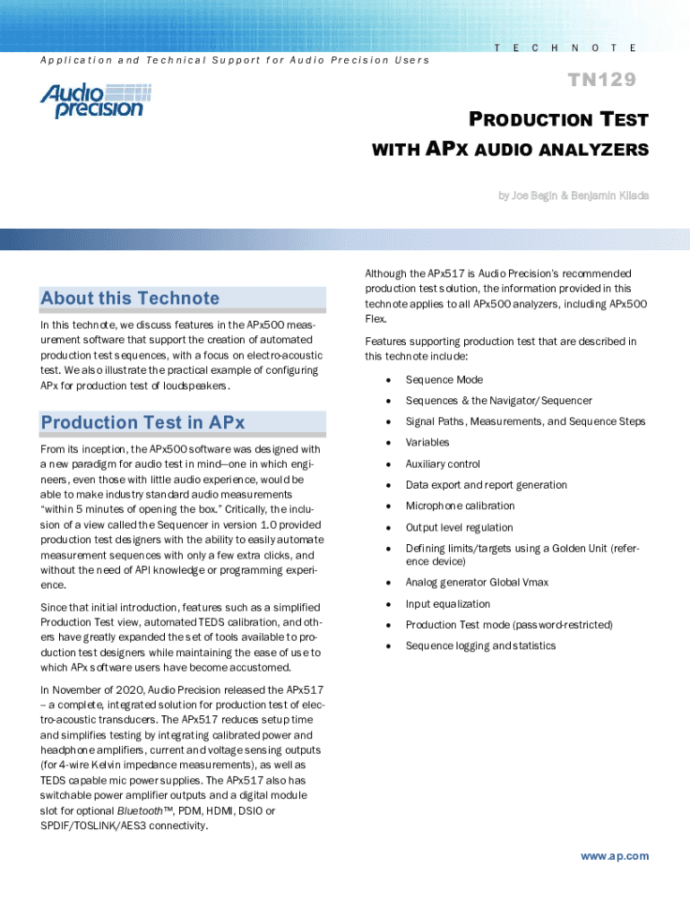 TECHNOTEApplication and Technical Support for Audio Precision UsersTN129PRODUCTION TEST WITH APX AUDIO ANALYZERS by Joe Begin & Benjamin KiladaAbout this Tech note In this tech note, we discuss features