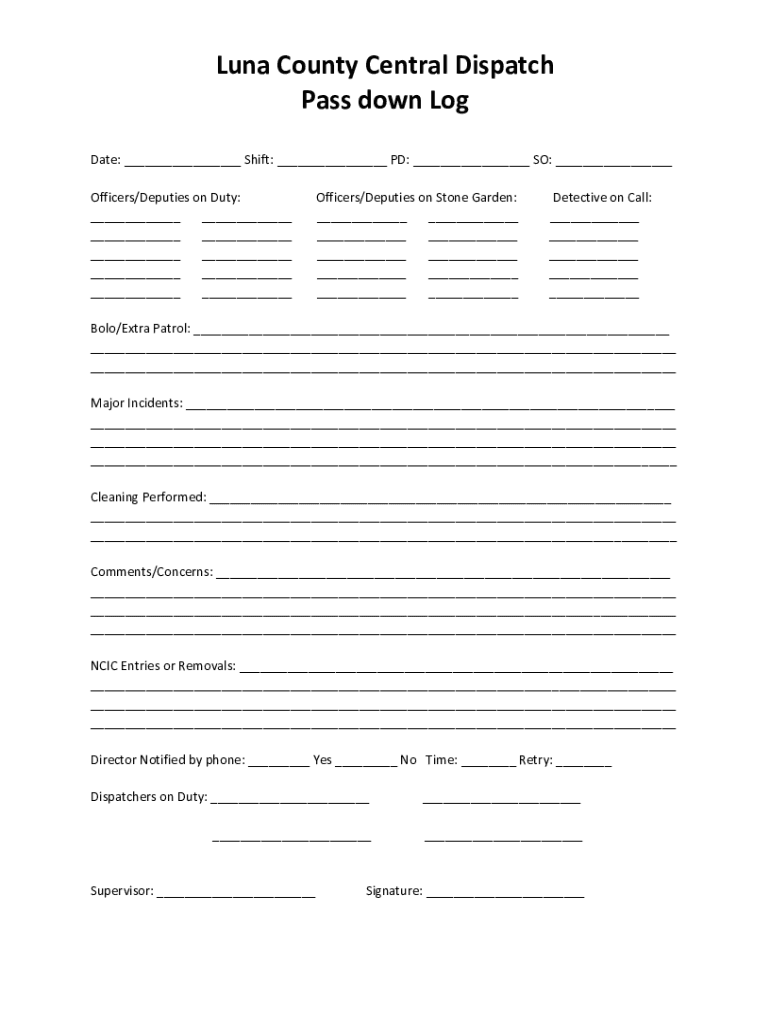 Print Luna County Central Dispatch Pass down Log Date: ___ Shift: ___ PD: ___ SO: ___ Officers/Deputies on Duty: ___ ___ ___ ___ ___ ___ ___ ___ ___ ___Officers/Deputies on Stone Garden: ___ ___ ___