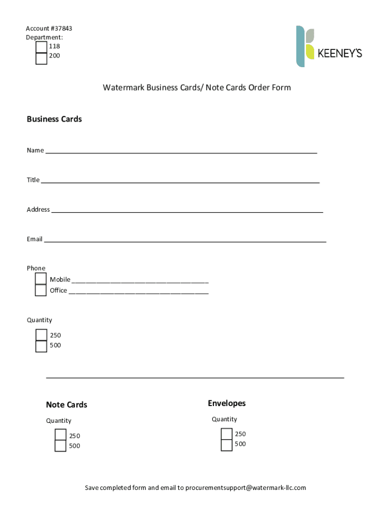 Account #37843 Department: 118 200Watermark Business Cards/ Note Cards Order Form Business Cards NameTitleAddressEmailPhone Mobile ___Office ___Quantity 250 500Note CardsEnvelopesQuantityQuantity