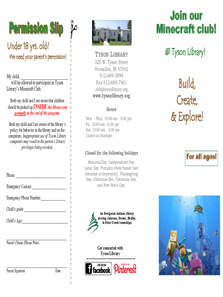 Join our Minecraft club! Under 18 yrs. Old? We need your parents permission! My child, ___ will be allowed to participate in Tyson Libraries Minecraft Club. Both my child and I are aware that children