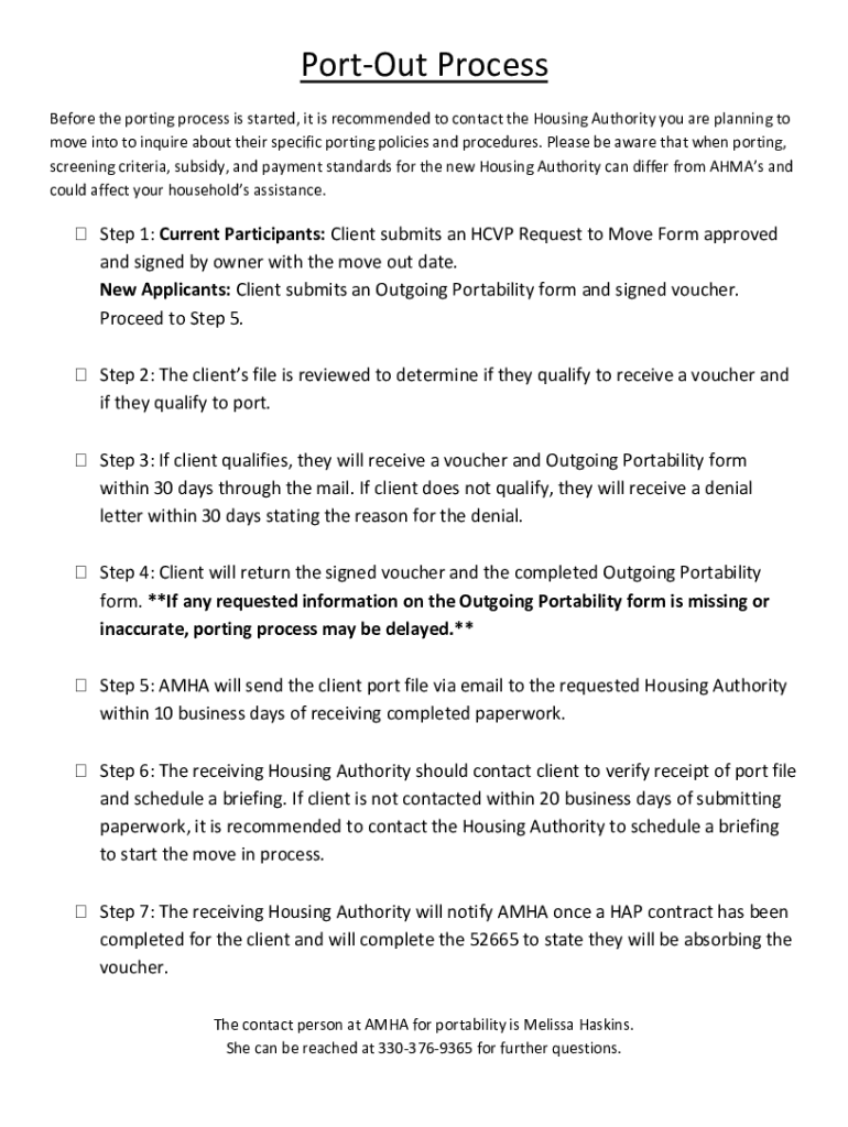 PortOutProcess Beforetheportingprocessisstarted, itisrecommendedtocontacttheHousingAuthorityyouareplanningto moveintotoinquireabouttheirspecificportingpoliciesandprocedures. Pleasebeawarethatwhenporting,