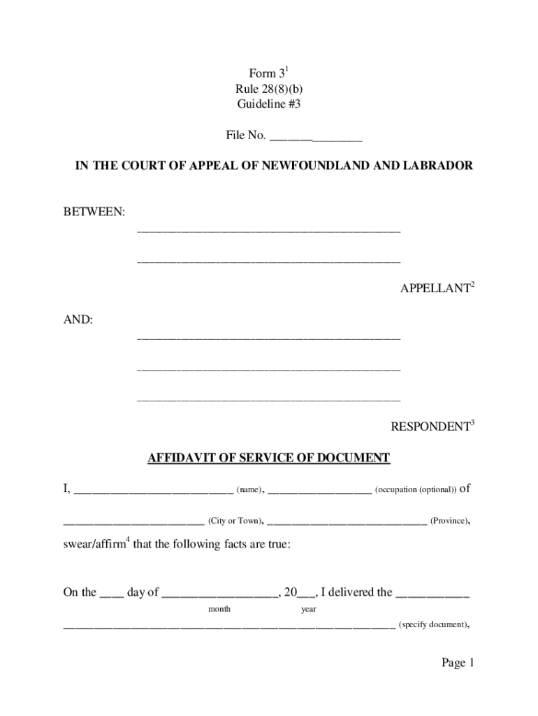 Form 31 Rule 28(8)(b) Guideline #3 File No. ___ IN THE COURT OF APPEAL OF NEWFOUNDLAND AND LABRADORBETWEEN: ______APPELLANT2 AND: _________RESPONDENT3 AFFIDAVIT OF SERVICE OF DOCUMENT I, ___ (name),