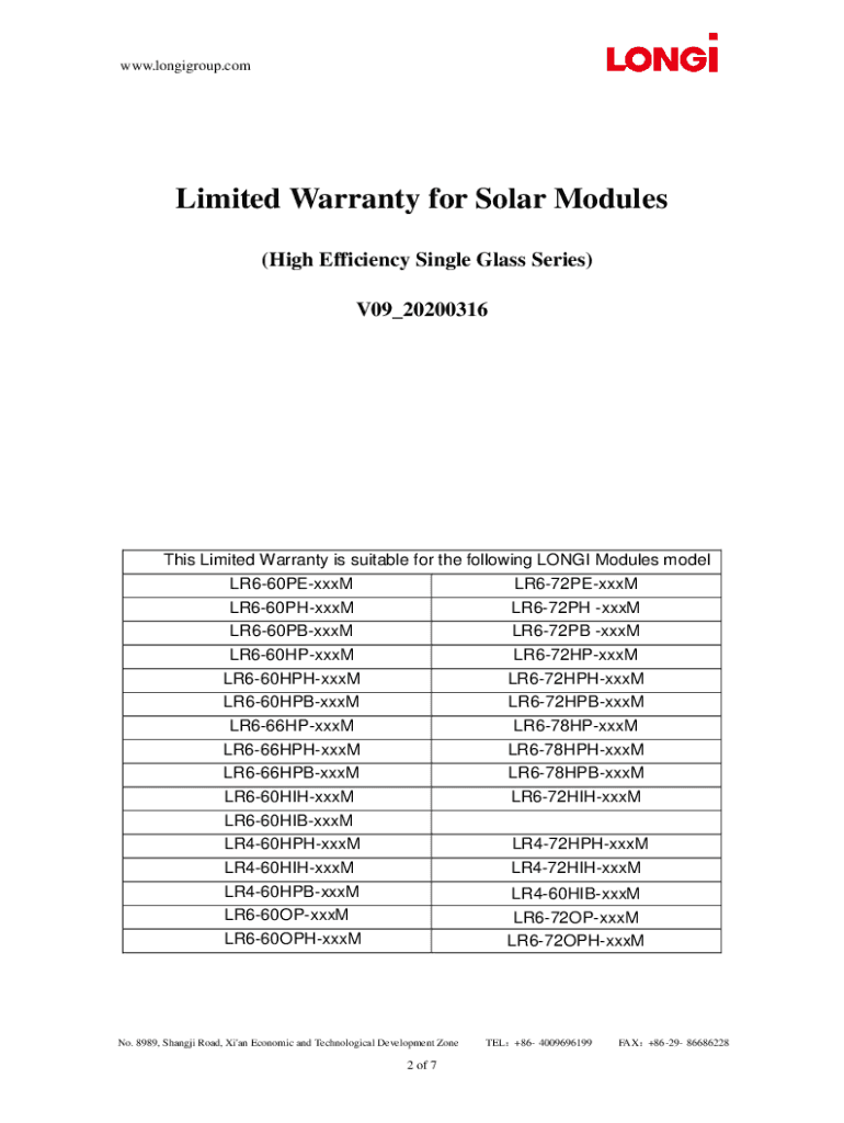 WWW.longigroup.limited Warranty for Solar Modules (High Efficiency Single Glass Series) V09_20200316This Limited Warranty is suitable for the following LONG Modules model LR660PExxxM LR672PExxxM LR660PHxxxM
