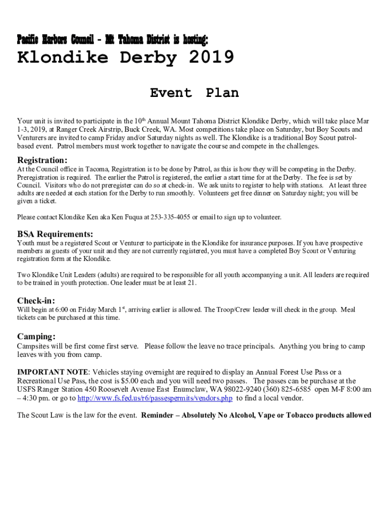 Pacific Harbors Council Mt Tahoma District is hosting:Klondike Derby 2019 Event Plan Your unit is invited to participate in the 10th Annual Mount Tahoma District Klondike Derby, which will take place
