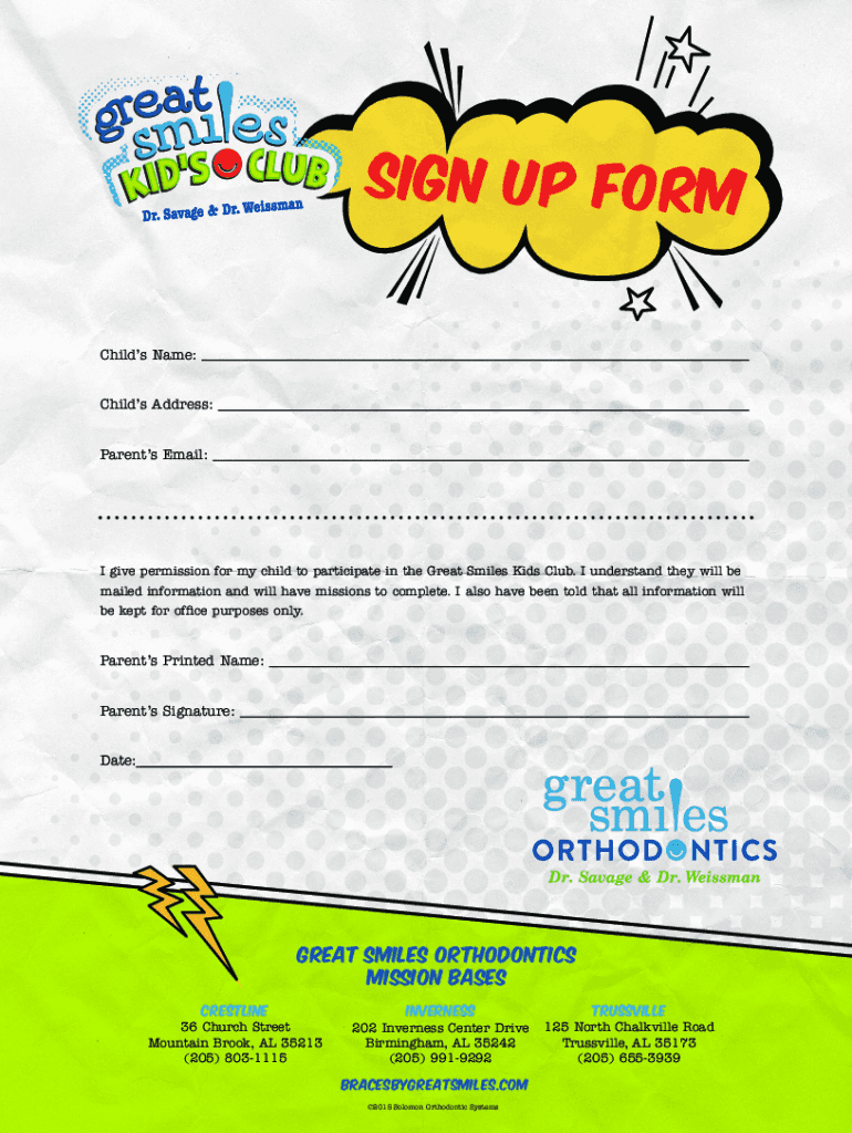 Sign Up Form Child's Name:Child's Address:Parents Email:I give permission for my child to participate in the Great Smiles Kids Club. I understand they will be mailed information and will have missions
