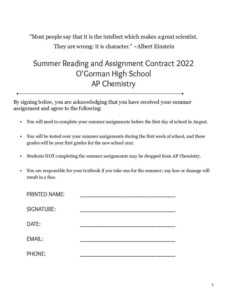 Most people say that it is the intellect which makes a great scientist. They are wrong: it is character. Albert Einstein Summer Reading and Assignment Contract 2022 O\'Gorman High School AP Chemistry