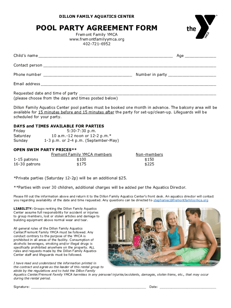 DILLON FAMILY AQUATICS INTERPOL PARTY AGREEMENT FORM Fremont Family YMCA www.fremontfamilyymca.org 4027216952Childs name ___Age ___Contact person ___ Phone number ___Number in party ___Email address