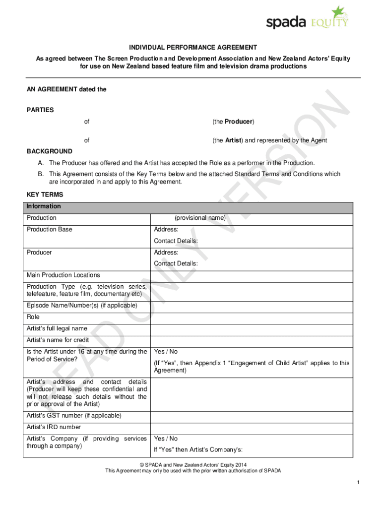 INDIVIDUAL PERFORMANCE AGREEMENT As agreed between The Screen Production and Development Association and New Zealand Actors Equity for use on New Zealand based feature film and television drama productions