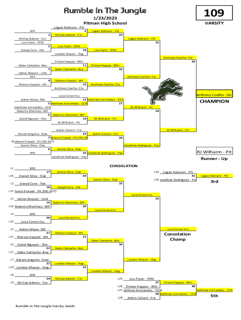 Rumble In The Jungle1091/23/2023 Pitman High SchoolVARSITYLogan Robinson PG BYE9 1Logan Robinson PG McCoy Adams Cer25McCoy Adams CER Leo Flynn STM Logan Robinson PG 33 2Davyd Era Tokyo Flynn STM 10