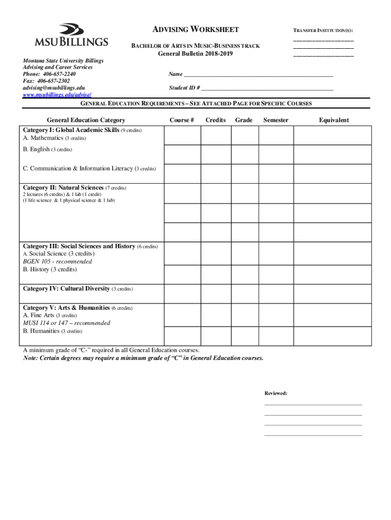 ADVISING WORKSHEETTRANSFER INSTITUTION(S):BACHELOR OF ARTS IN MUSICBUSINESS TRACK General Bulletin 20182019___ ___ ___Montana State University Billings Advising and Career Services Phone: 4066572240