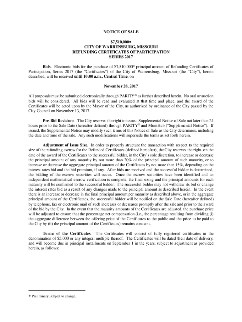 NOTICE OF SALE $7,510,000 CITY OF HARRISBURG, MISSOURI REFUNDING CERTIFICATES OF PARTICIPATION SERIES 2017 Bids. Electronic bids for the purchase of $7,510,000* principal amount of Refunding Certificates