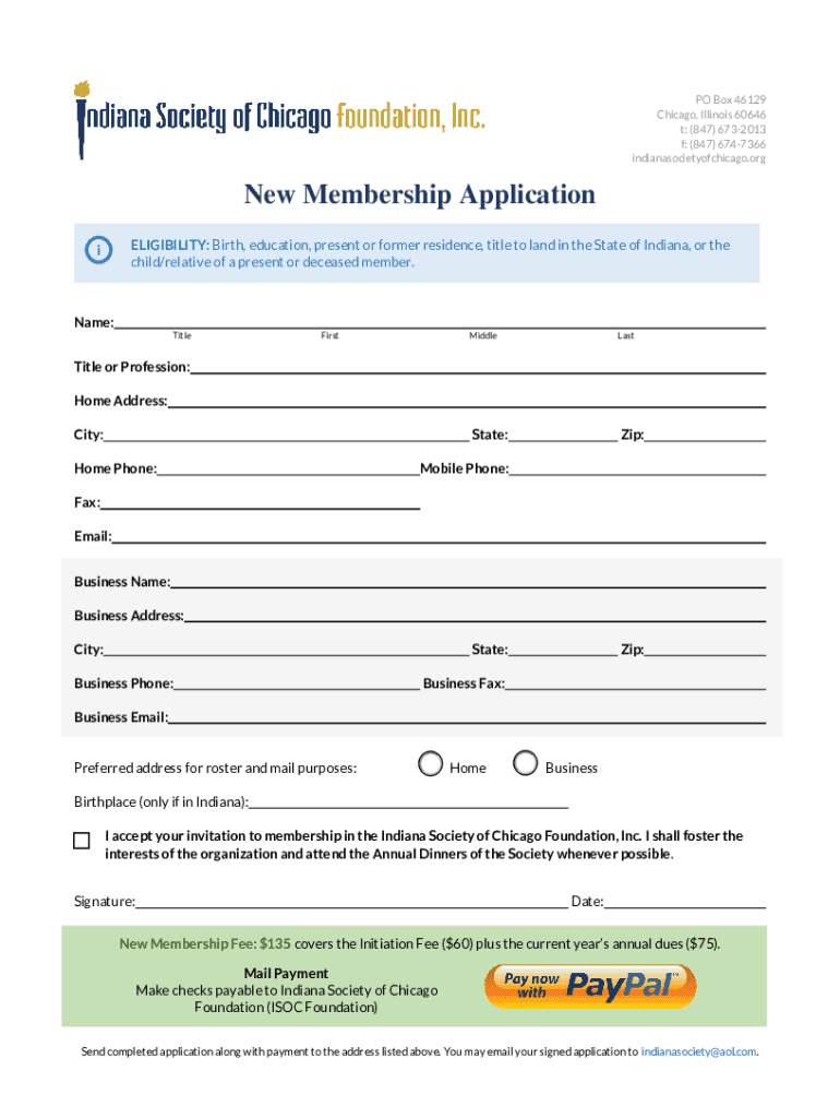 PO Box 46129 Chicago, Illinois 60646 t: (847) 6732013 f: (847) 6747366 indianasocietyofchicago. Renew Membership Application ELIGIBILITY: Birth, education, present or former residence, title to land