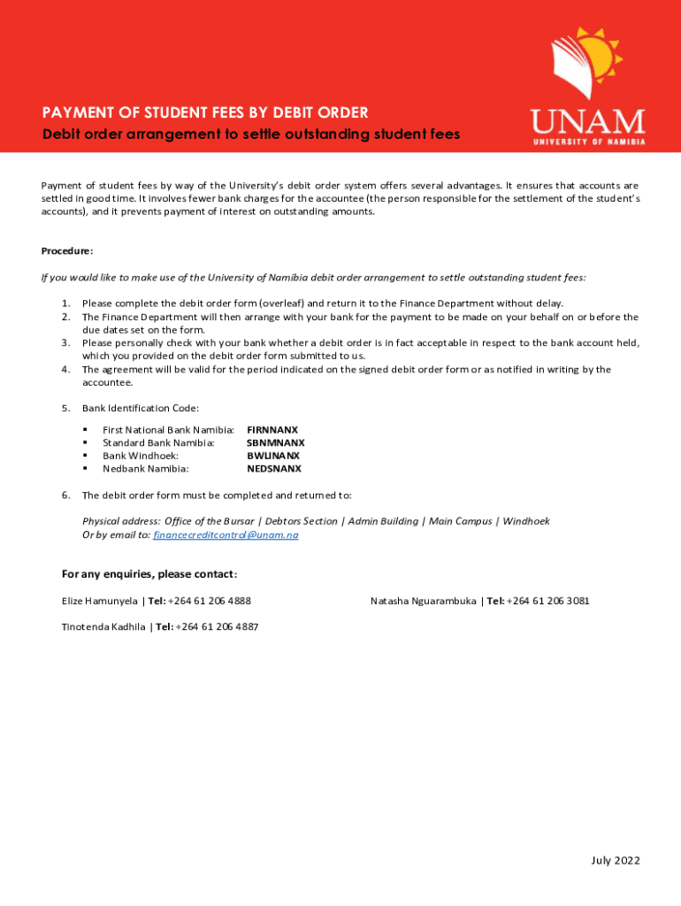 Obtain an unam debit order form from your bank or directly from the University of Namibia (UNAM).