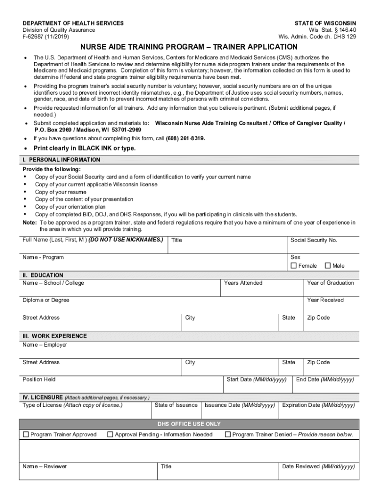 DEPARTMENT OF HEALTH SERVICES Division of Quality Assurance F62687 (11/2019)STATE OF WISCONSIN Wis. Stat. 146.40 Wis. Admin. Code ch. DHS 129NURSE AIDE TRAINING PROGRAM TRAINER APPLICATION The U.S.