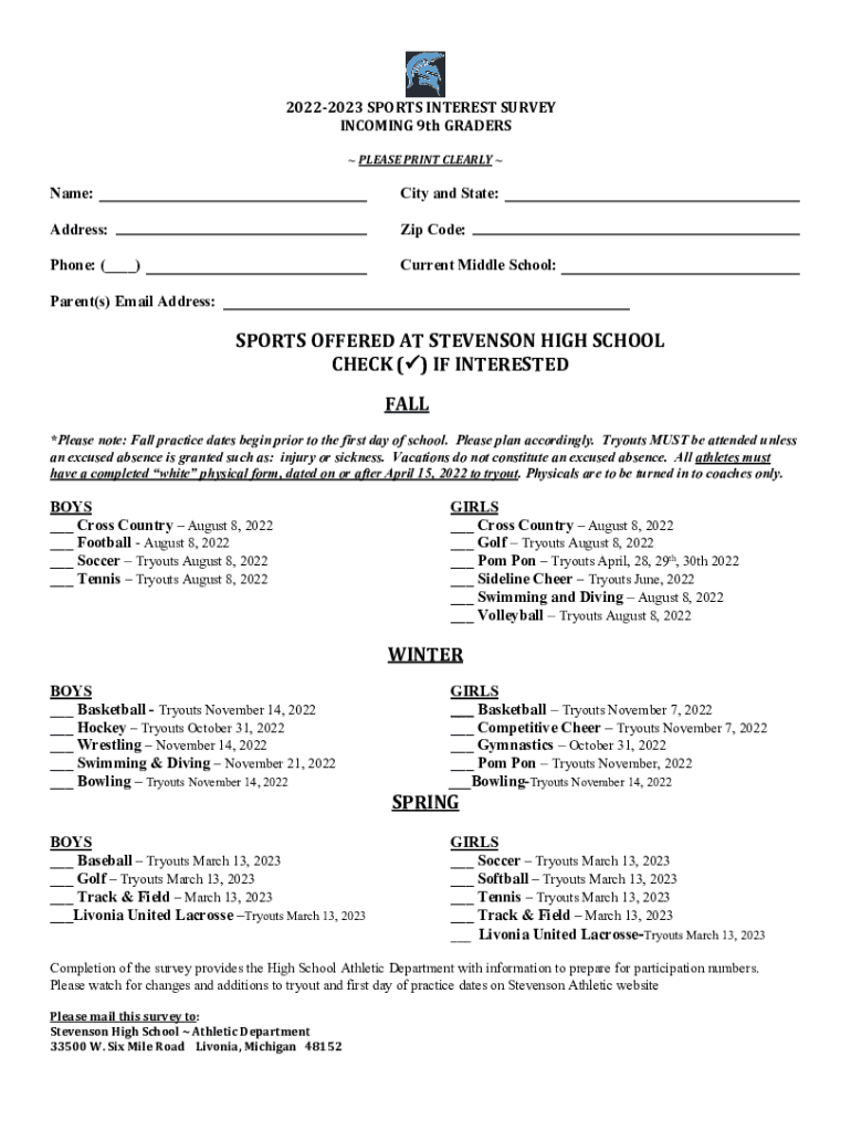 20222023 SPORTS INTEREST SURVEY INCOMING 9th GRADERS PLEASE PRINT CLEARLY Name:City and State:Address:Zip Code:Phone: (___)Current Middle School:Parent(s) Email Address:SPORTS OFFERED AT STEVENSON