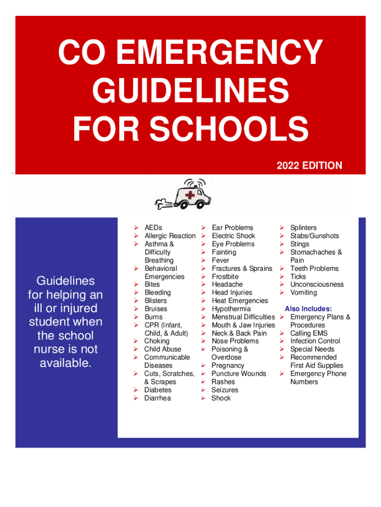 CO EMERGENCY GUIDELINES FOR SCHOOLSt2022 EDITIONGuidelines for helping an ill or injured student when the school nurse is not available. AED's Ear Splinters LIST Problems CONTENTS Allergic Reaction