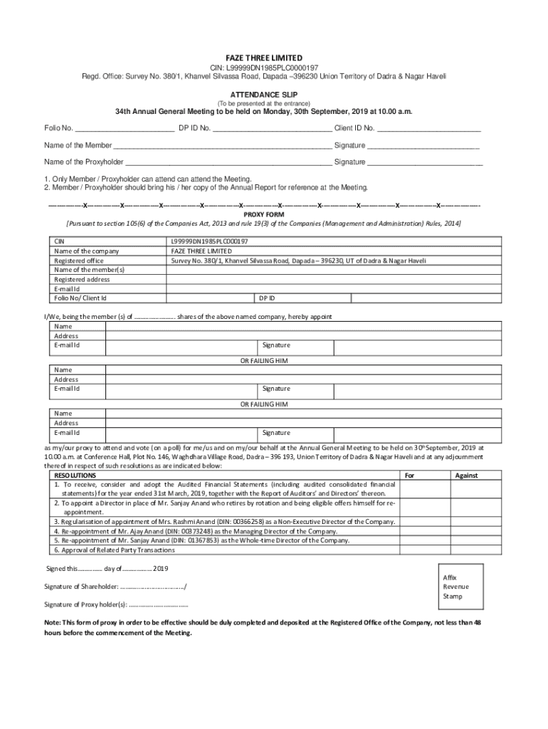 FAZE THREE LIMITED IN: L99999DN1985PLC0000197 Red. Office: Survey No. 380/1, Channel Silvana Road, Canada 396230 Union Territory of Dada & Nagar Havel ATTENDANCE SLIP (To be presented at the entrance)34th