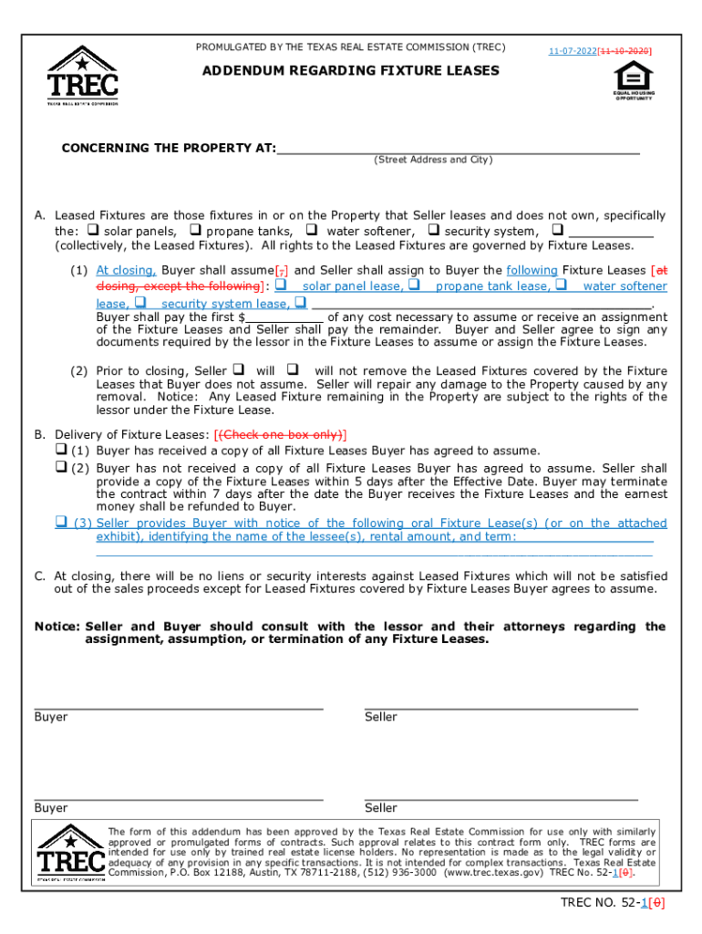 PROMULGATED BY THE TEXAS REAL ESTATE COMMISSION (TREE)11072022[11102020]ADDENDUM REGARDING FIXTURE LEASES EQUAL HOUSING OPPORTUNITYCONCERNING THE PROPERTY AT:(Street Address and City)A. Leased Fixtures