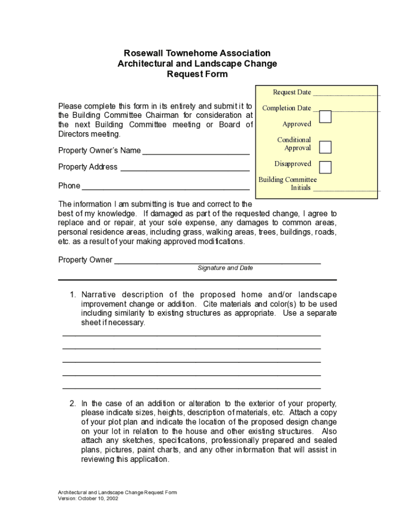 Information such as the proposed changes, dimensions, materials, and estimated costs may need to be reported on architectural and landscape change forms.