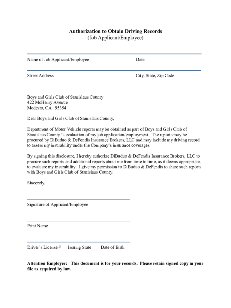 Get the free Authorization to Obtain Driving Records (Job Applicant/Employee)