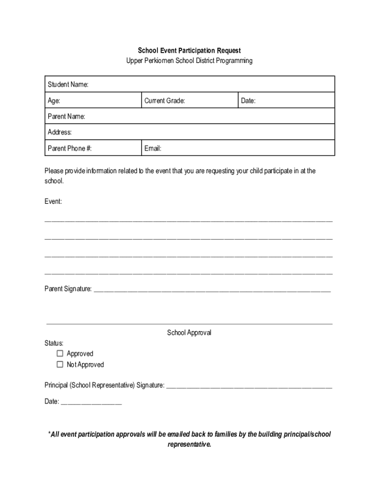 School Event Participation Request Upper Persimmon School District Programming Student Name: Age:Current Grade:Date:Parent Name: Address: Parent Phone #:Email:Please provide information related to
