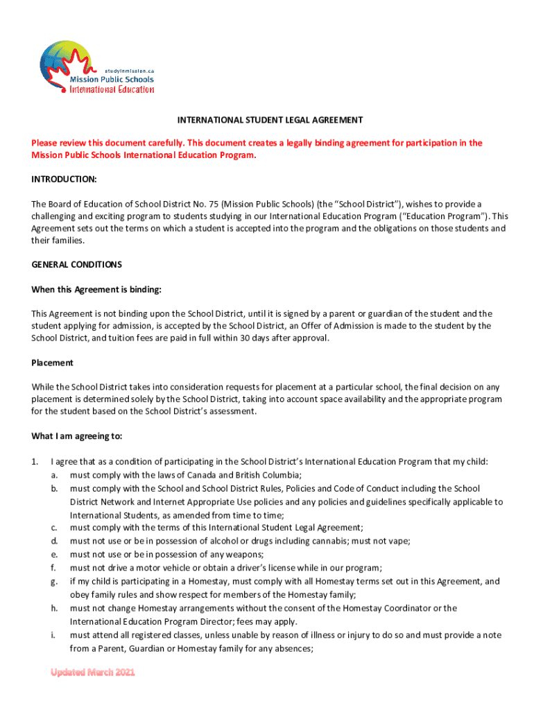 INTERNATIONAL STUDENT LEGAL AGREEMENT Please review this document carefully. This document creates a legally binding agreement for participation in the Mission Public Schools International Education