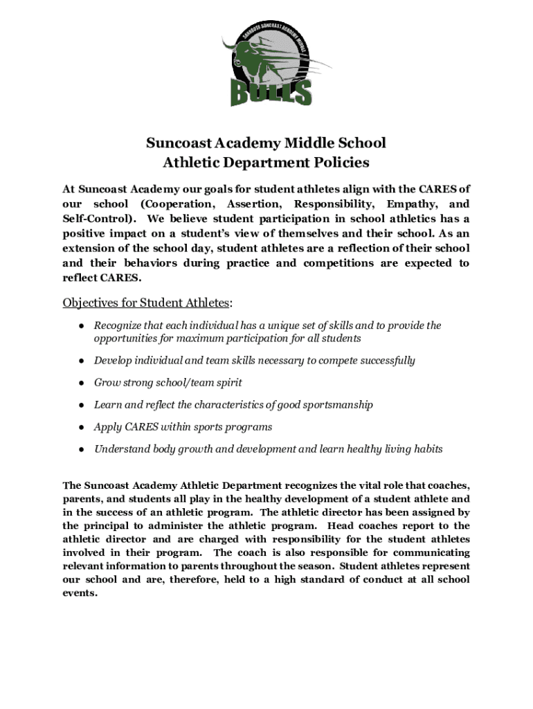 Sun coast Academy Middle School Athletic Department Policies At Sun coast Academy our goals for student athletes align with the CARES of our school (Cooperation, Assertion, Responsibility, Empathy,