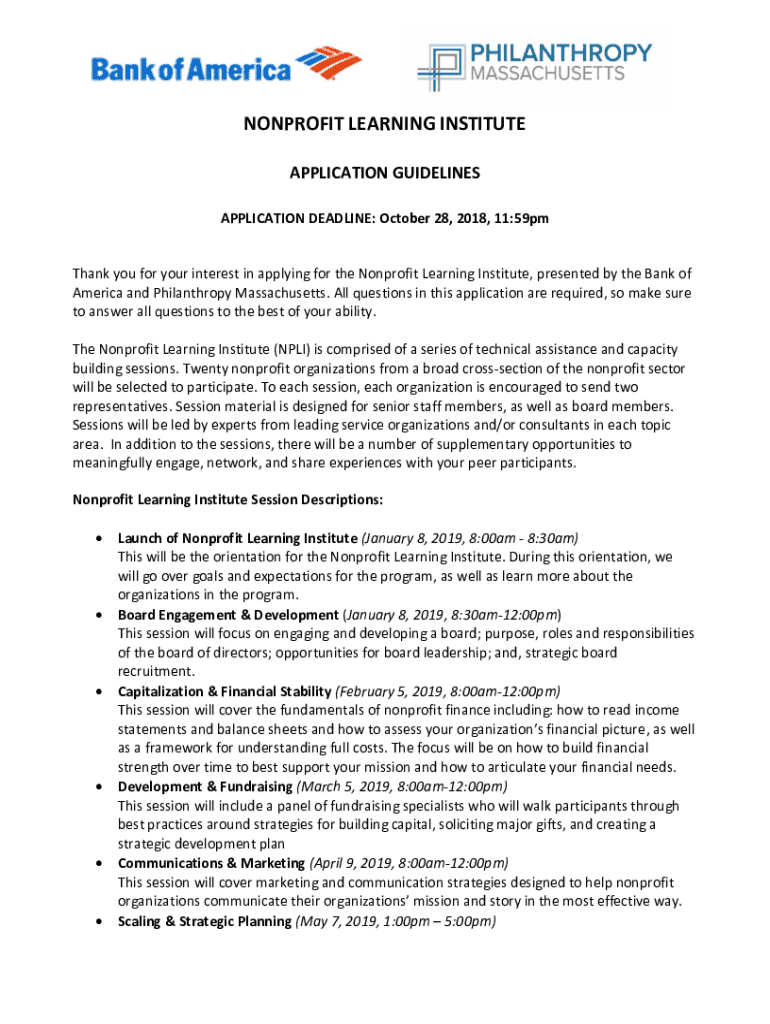 NONPROFIT LEARNING INSTITUTE APPLICATION GUIDELINES APPLICATION DEADLINE: October 28, 2018, 11:59pmThank you for your interest in applying for the Nonprofit Learning Institute, presented by the Bank