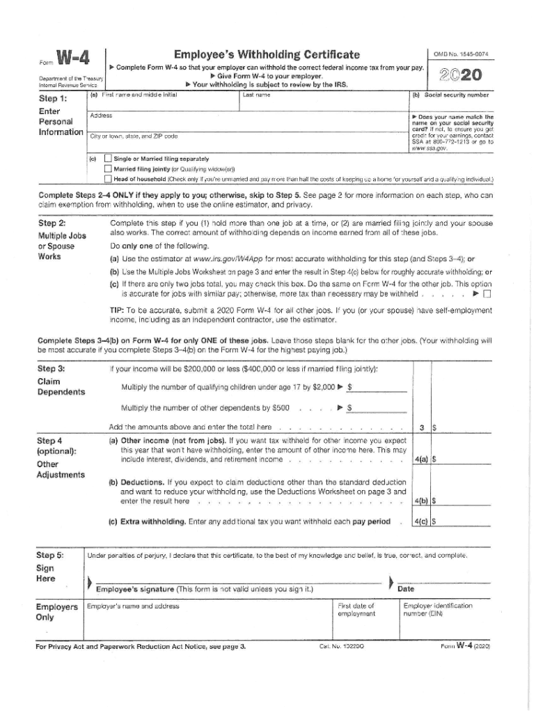 FormEmployee\'s Withholding CertificateW4Department of the Treasury Internal Revenue Services 1: Enter Personal Information0MB No. 15450074Complete Form W4 so that your employer can withhold the correct