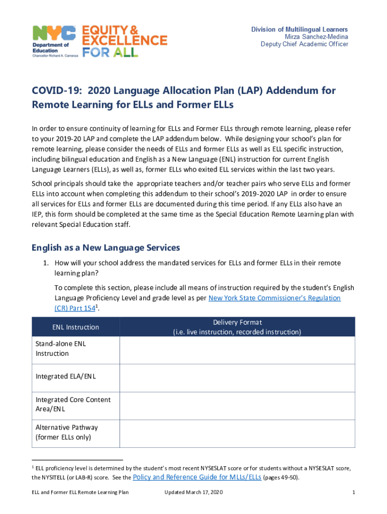 COVID-19: 2020 Language Allocation Plan (LAP) Addendum for Remote Learning for Ells and Former Ells In order to ensure continuity of learning for Ells and Former Ells through remote learning, please