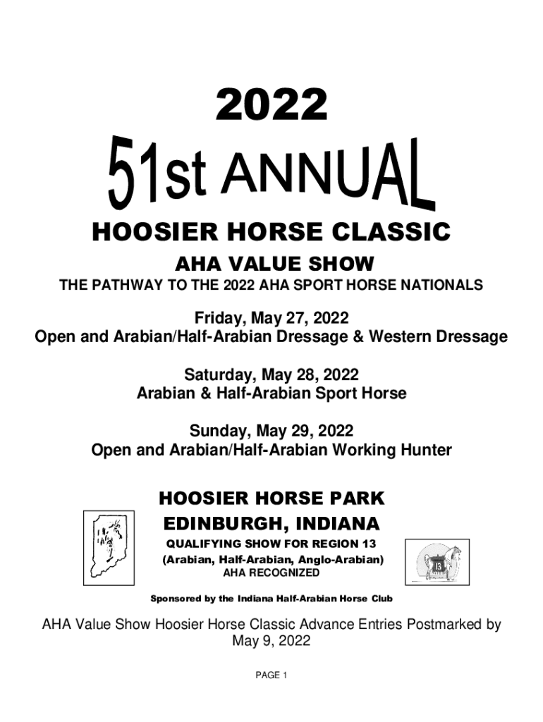 2022 HOOSIER HORSE CLASSIC AHA VALUE SHOW THE PATHWAY TO THE 2022 AHA SPORT HORSE NATIONALS Friday, May 27, 2022, Open and Arabian/Half Arabian Dressage & Western Dressage Saturday, May 28, 2022,