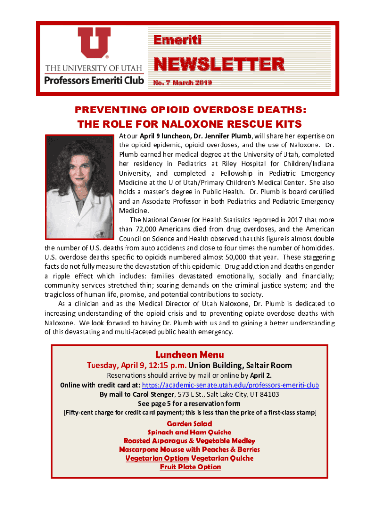 EmeritiNEWSLETTER No. 7 March 2019PREVENTING OPIOID OVERDOSE DEATHS: THE ROLE FOR NALOXONE RESCUE KITS At our April 9 luncheon, Dr. Jennifer Plumb, will share her expertise on the opioid epidemic,