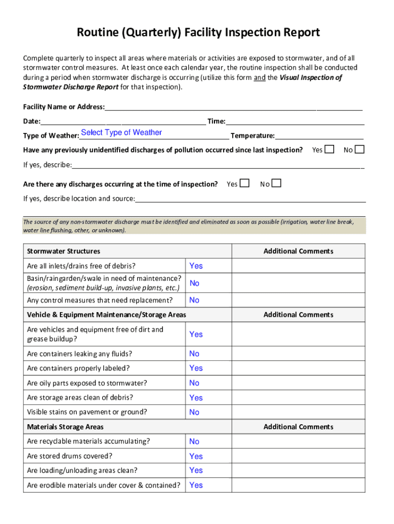 Routine (Quarterly) Facility Inspection Report Complete quarterly to inspect all areas where materials or activities are exposed to stormwater, and of all stormwater control measures. At least once