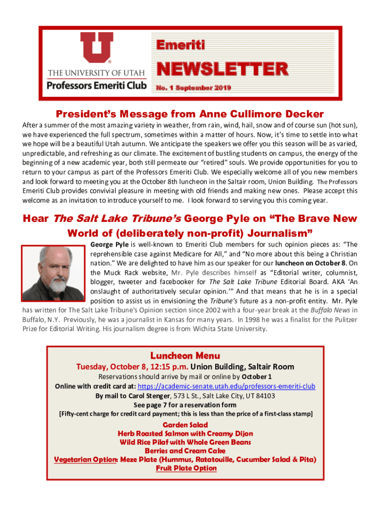 EmeritiNEWSLETTER No. 1 September 2019Presidents Message from Anne Baltimore Decker After a summer of the most amazing variety in weather, from rain, wind, hail, snow and of course sun (hot sun),