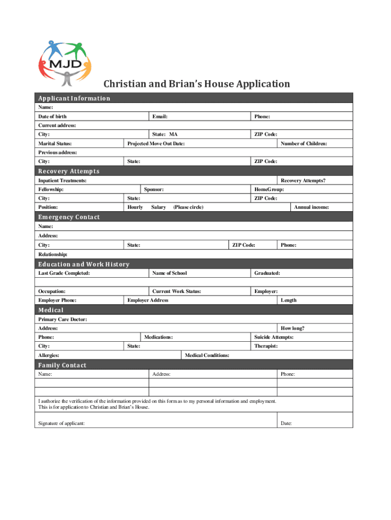 Christian and Brian's House Application Applicant Information Name: Date of birthmark:Phone:State: MAZIP Code:Current address: City: Marital Status:Projected Move Out Date:Number of Children:Previous