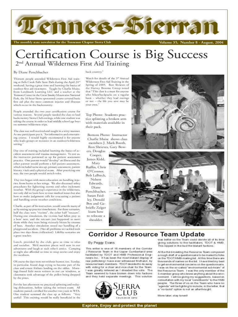 The monthly state newsletter for the Tennessee Chapter Sierra Clubhouse 35, Number 8 August, 2004Certication Course is Big Success 2nd Annual Wilderness First Aid Training By Diane Perschbacherback