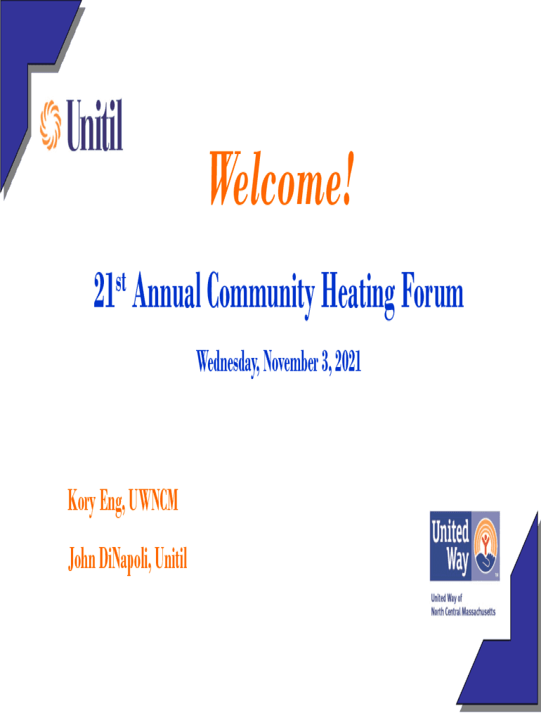 Welcome! 21st Annual Community Heating Forum Wednesday, November 3, 2021Kory Eng, UNC John Dipole, Uniting England Farm Workers Council (NEW)Federal Fuel Assistance Programs Norma Alvarez NEFWCNEW