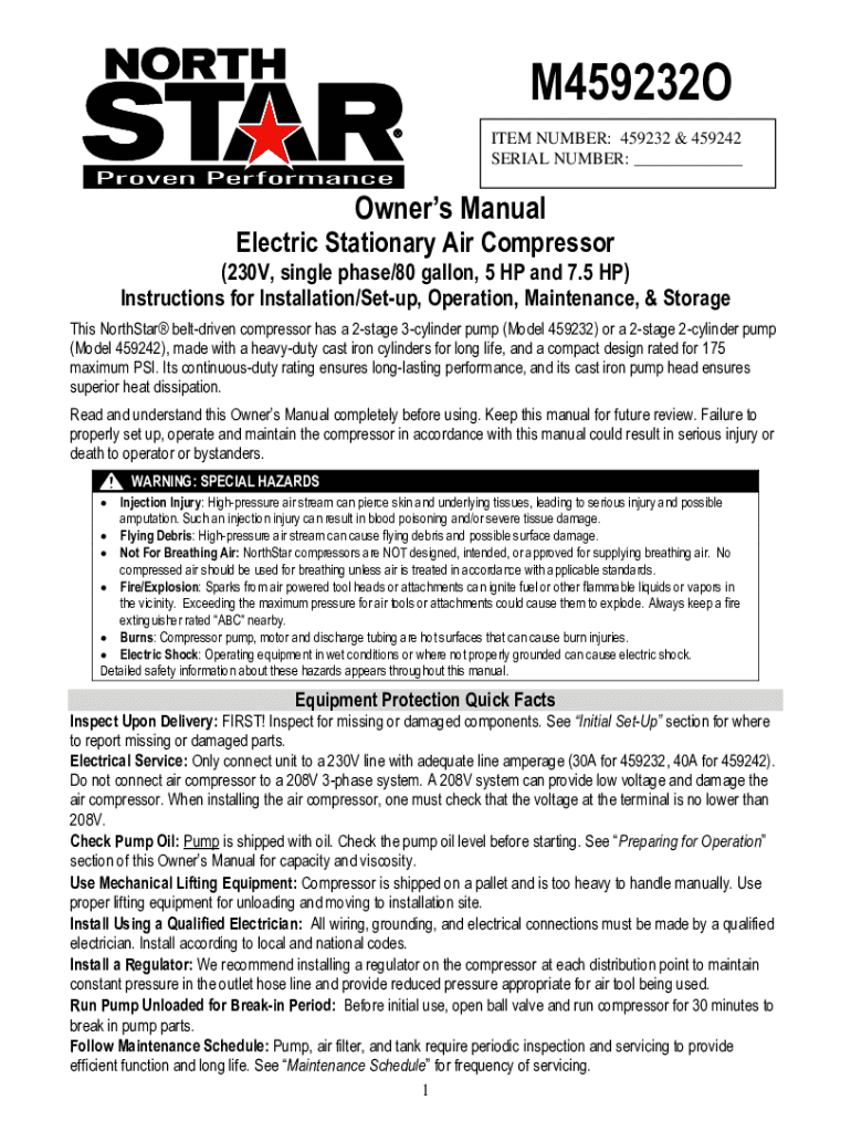 M459232O ITEM NUMBER: 459232 & 459242 SERIAL NUMBER: ___Owners ManualElectric Stationary Air Compressor (230V, single phase/80 gallon, 5 HP and 7.5 HP) Instructions for Installation/Setup, Operation,