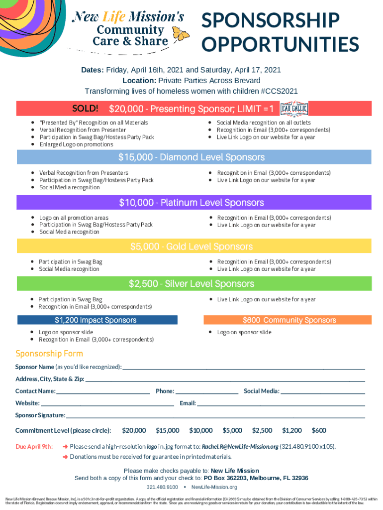 SPONSORSHIP OPPORTUNITIES Dates: Friday, April 16th, 2021 and Saturday, April 17, 2021, Location: Private Parties Across Brevard Transforming lives of homeless women with children #CCS2021SOLD!$20,000