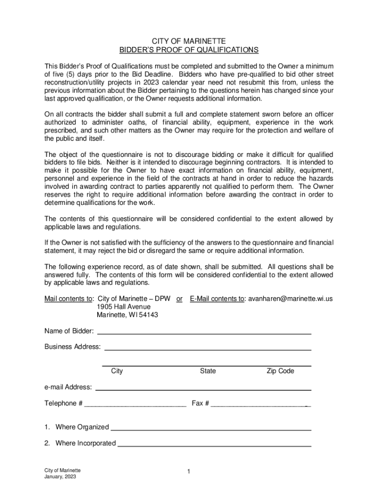 Get the free Statement of Bidder's Qualifications - City of Marinette