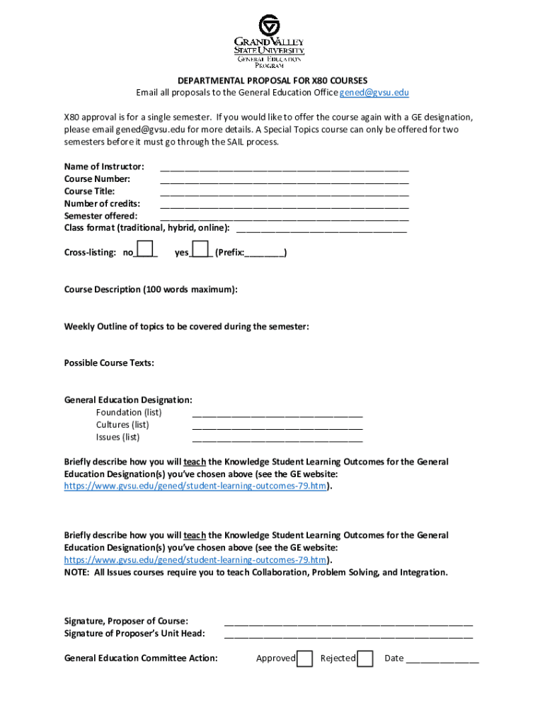 DEPARTMENTAL PROPOSAL FOR X80 COURSES Email all proposals to the General Education Office gened@gvsu.edu X80 approval is for a single semester. If you would like to offer the course again with a GE