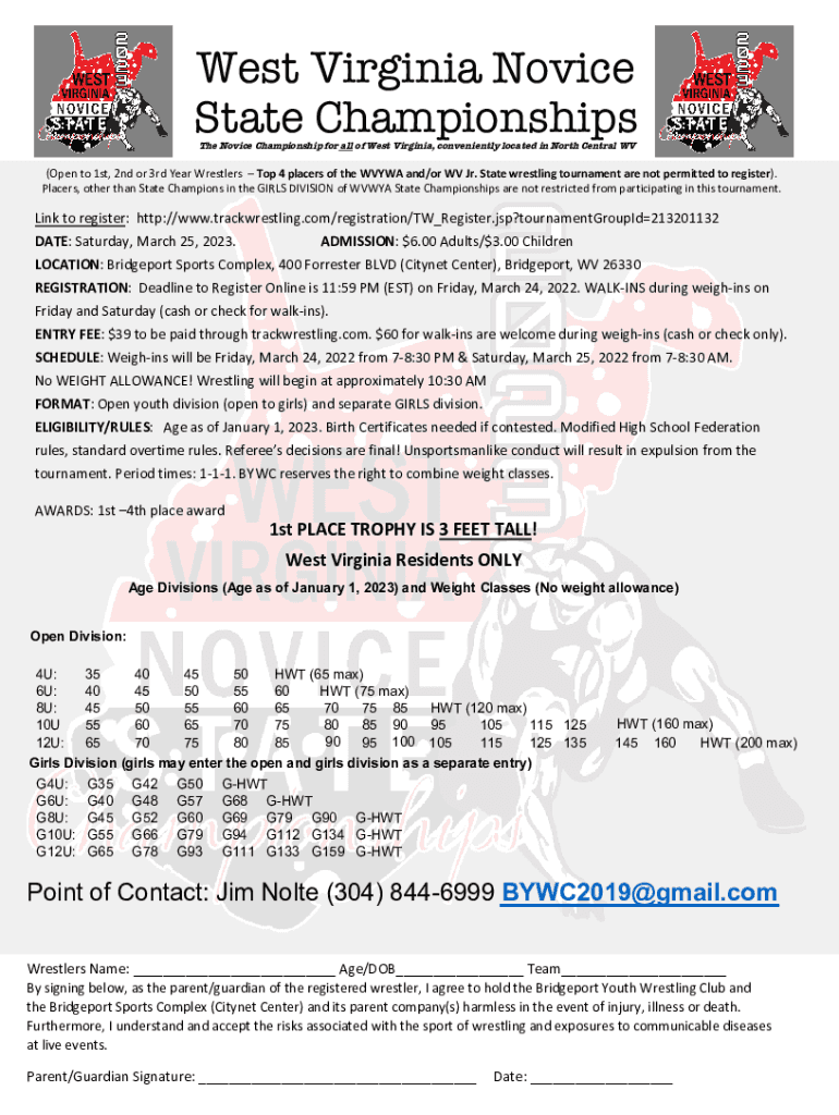 West Virginia Novice State Championships The Novice Championship for all of West Virginia, conveniently located in North Central WV(Open to 1st, 2nd or 3rd Year Wrestlers Top 4 placers of the WWA