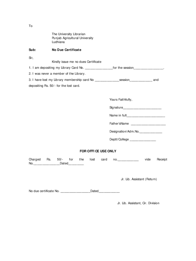 To The University Librarian Punjab Agricultural University Ludhiana Sub: Sir, No Due Certificate Kindly issue me no dues Certificate1. I am depositing my Library Card No. ___for the session___. 2.