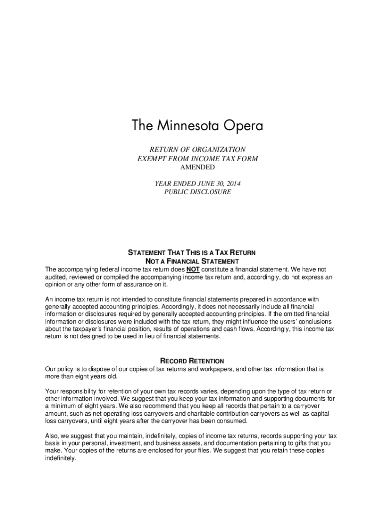 The Minnesota Opera RETURN OF ORGANIZATION EXEMPT FROM INCOME TAX FORM AMENDED YEAR ENDED JUNE 30, 2014, PUBLIC DISCLOSURESTATEMENT THAT THIS IS A TAX RETURN NOT A FINANCIAL STATEMENT The accompanying